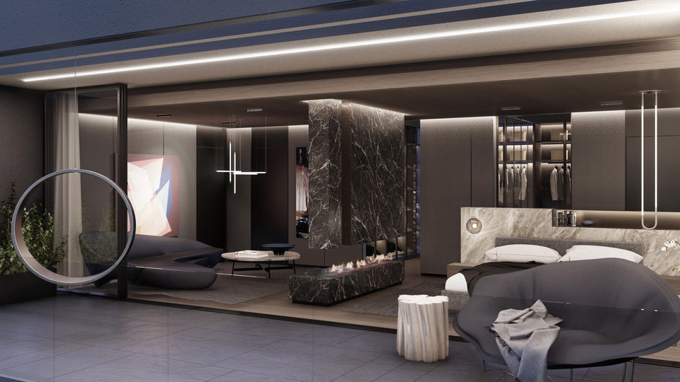 The left wing hosts dual lounges— formal and informal —centered around an open fireplace, creating a balance of refined opulence and sophistication.